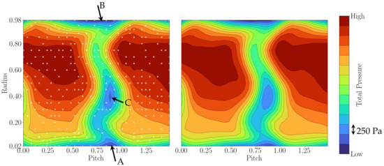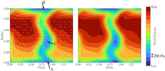 Figure 6 illustrates the comparison between the predicted total pressure flow values (), on the right, and the ground truth validation data (). The selected experimental grid is represented with white crosses.