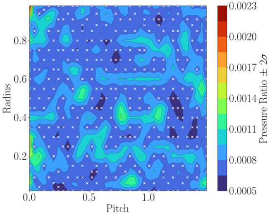 Figure 9 extends the qualitative examination by illustrating the uncertainty in the predicted pressure ratio (). This provides insights into the areas where the CFD to Experiments GP approach exhibits higher uncertainty.