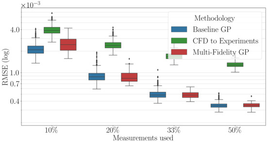 In contrast, the Baseline GP and Multi-Fidelity GP exhibit comparable performance. The box plots for both models show similar medians, suggesting a consistent level of accuracy across different subsampling percentages. However, the Multi-Fidelity GP stands out as a more robust option, as evidenced by its lower box plot spread and fewer outliers. This indicates that the Multi-Fidelity GP is less sensitive to variations in the experimental grid and maintains a stable performance even with reduced measurement data since the spread between the box plot whiskers can be primarily attributed to the influence of the randomly selected experimental measurement grids. The outliers correspond to random generated grids where the measurement points are clustered in regions of low-gradients. In these cases, the Multi-Fidelity GP can still rely on the gradients from the CFD, while the Baseline GP model cannot due to lack of information.