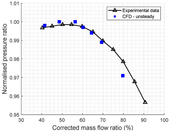 One objective of this paper is to show that a low-cost methodology can be used to estimate the mass flow rate of the last stable operating point observed from full-annulus unsteady simulations. So, full-annulus simulations performed for the present work will be considered as the reference. However, it is still possible to validate the stability limit estimated from the URANS simulations by comparing it with measurements carried out at Liebherr-Aerospace Toulouse on the CMP-1 compressor. The test rig was equipped with three static pressure sensors, uniformly distributed along the pipe circumference, located after a duct bend downstream of the volute. The flow meter was located in the intake duct less than one meter from the compressor inlet. To reproduce experimental conditions, upstream and downstream ducts have been included in the numerical simulations. Thus, a numerical time-averaged outlet static pressure has been computed from three near-wall probes located at the exact measurement coordinates. Furthermore, numerical calculations have been set with the real experimental conditions to avoid the effects of a change in the Reynolds number that would directly impact boundary layer thicknesses. Hence, the comparison between experimental data and results from unsteady numerical simulations is based on a total-to-static pressure ratio normalised by the maximum measured value and plotted as a function of the corrected mass flow. This corrected mass flow rate is normalised by its expected value at choke conditions. The closest measured speed line to the one investigated in the present work corresponds to 97% of the studied rotation rate. Hence, the comparison between experimental and numerical data is performed at 97% of the rotation rate of interest.