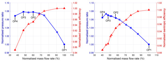 Studied operating point locations on the compressors’ characteristic curves (from URANS calculations, left: CMP-1/right: CMP-2).