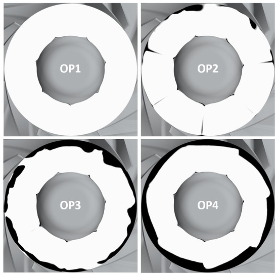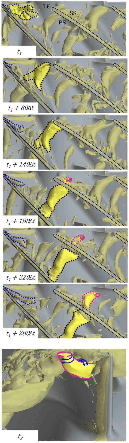 Figure 4 uses the criterion to highlight the BFV role in the inducer destabilisation occurring at OP2. Between and , a backflow vortex emerges from under a tip leakage vortex. Under the influence of the volute tongue potential effect, described in previous work [8], it reaches the next blade leading edge while similar structures in other blade passages still go through the clearance at downstream locations. In these circumstances, the following BFV is split into two parts: the downstream one will propagate in the passage, while the second will interact with the leading edge boundary layer. This interaction leads to a separation confined to the leading edge’s upper part. Due to the velocity difference, the interface between the main incoming flow and the low momentum flow from the leading edge boundary layer separation forms a severe shear layer. By a Kelvin–Helmholtz mechanism described by Pullan et al. [26] and Bousquet et al. [15], a tornado-like vortex develops from the blade suction side to the shroud. As shown in Figure 4 at and , this structure is periodically generated. By moving in the blade passage , the vortex subject to the reverse tip and main flow stresses evolves in another backflow vortex with a casing end migrating toward the next blade . Unlike present tornado vortices, the structures analysed by Bousquet et al. [15] do not necessarily require backflow vortex action to trigger the leading edge separation. In the previous work from Pullan et al. [26] on an axial compressor, these vortices are identified as “spike structures” and can simply be caused by an incidence excess without tip clearance. This author describes this topology as a starting point for spike-type rotating stalls.