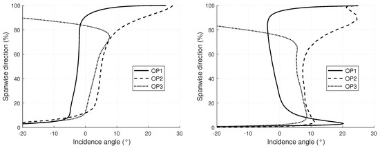 The backflow vortex area can occupy more than of the upper part of inducer passages deviating the incoming flow in the tip region. As illustrated by Figure 5, a focus on the plots corresponding to the operating points OP1 and OP2 reveals that such a phenomenon causes a significant increase in the incidence angle located around the tip regions. For the two compressors, these plots compare circumferentially averaged incidence profiles () for the operating points OP1, OP2, and OP3. A dedicated paragraph will analyse the lines associated with this last operating point. For both compressors, the incidence increases globally due to the mass flow reduction between OP1 and OP2. At OP2, the presence of the previously described near-shroud vortical structures causes a local increase in the incidence.