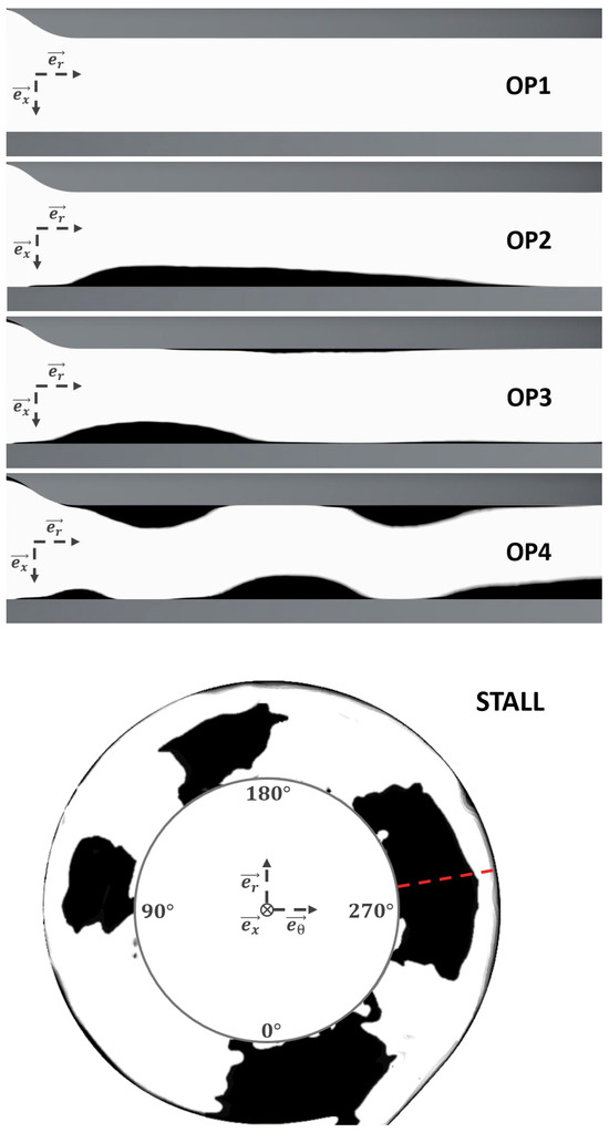 However, any additional throttling leads to the emergence of a four-cell rotating stall pattern brought to light by the last visualisation in Figure 7 at a 50% span. These cells propagate circumferentially at about 30% of the impeller rotation rate. According to the observations of Grapow et al. [37], based on PIV measurements, such rotating stall cells result from a merging process of the separation bubbles observed on the hub and shroud at OP4. In this configuration, the overall system is affected, and the surge occurs. Similar phenomena are observed from OP1 to OP4 in the second CMP-2 compressor. For each compressor, all along the speed lines, a continuous decrease in the static pressure recovery coefficient and an increase in the loss coefficient is observed.