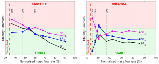 At the last stable operating point OP4, the inducers host fully developed near-shroud recirculations while the core flows in the diffusers also become unstable. Both are loss mechanisms that can contribute to or be the cause of the surge initiation. A first-order stability analysis is performed to identify the phenomena responsible for the entry into the surge regime. According to Dean [38], the method used is based on the characteristic curve slopes of the different components. By considering the total-to-static pressure ratio for the impellers and the static-to-static for the stators, a logarithmic differentiation allows highlighting stability parameters , whose sign informs about the component’s stabilising or destabilising behaviour. A negative value is associated with a stable component having a stabilising effect on the stage. In contrast, a positive one is linked to an unstable component destabilising the compressor.