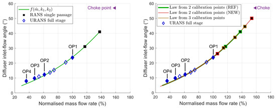 The plot at the left of Figure 10 compares the angle evolution law calibrated from the single-passage RANS calculations with results from the full-annulus unsteady simulations with volute. On the whole, both are in good agreement near the calibration points. The change in the flow field structure induced by the mass flow reduction causes an increasing deviation. At OP1, the calibrated law overestimates the flow angle value of 0.2°. Such a small difference is insignificant. On the last stable operating point, OP4, the gap is maximum between both and is about 1.2°. Given the variation range of the angle values on this speed line, such a difference is acceptable, especially in a preliminary design context. As illustrated by the plot at the right of Figure 10, the distribution of the two RANS calculations has an insignificant effect on the calibration parameter values as long as the choke point is not used and the chosen points remain in the negative part of the efficiency curve. Furthermore, adding an additional calibration point (brown curve) does not improve the extrapolation accuracy.