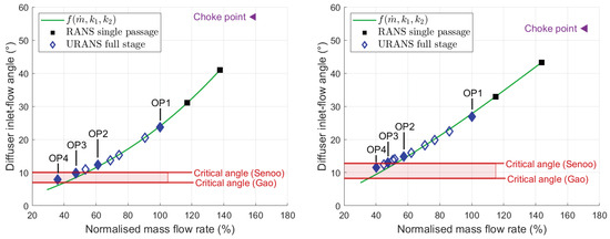 By admitting that the compressor stability limit is associated with diffuser destabilisation, finding the last stable operating points is a matter of finding the conditions for which the diffuser inlet-flow angle reaches its critical value. It is possible to use models from the literature to estimate this critical value (). Senoo and Kinoshita [43,44,45] used the three-dimensional boundary layer theory while Abdelhamid [46] performed a two-dimensional, inviscid, and incompressible stability analysis to highlight the strong dependency of the critical flow angle on two geometrical parameters: the radius and width ratios. A few years later, numerical approaches were considered, such as the model of Gao et al. [47] based on wavelet neural networks or the one of Ljevar [39] for wide diffusers.