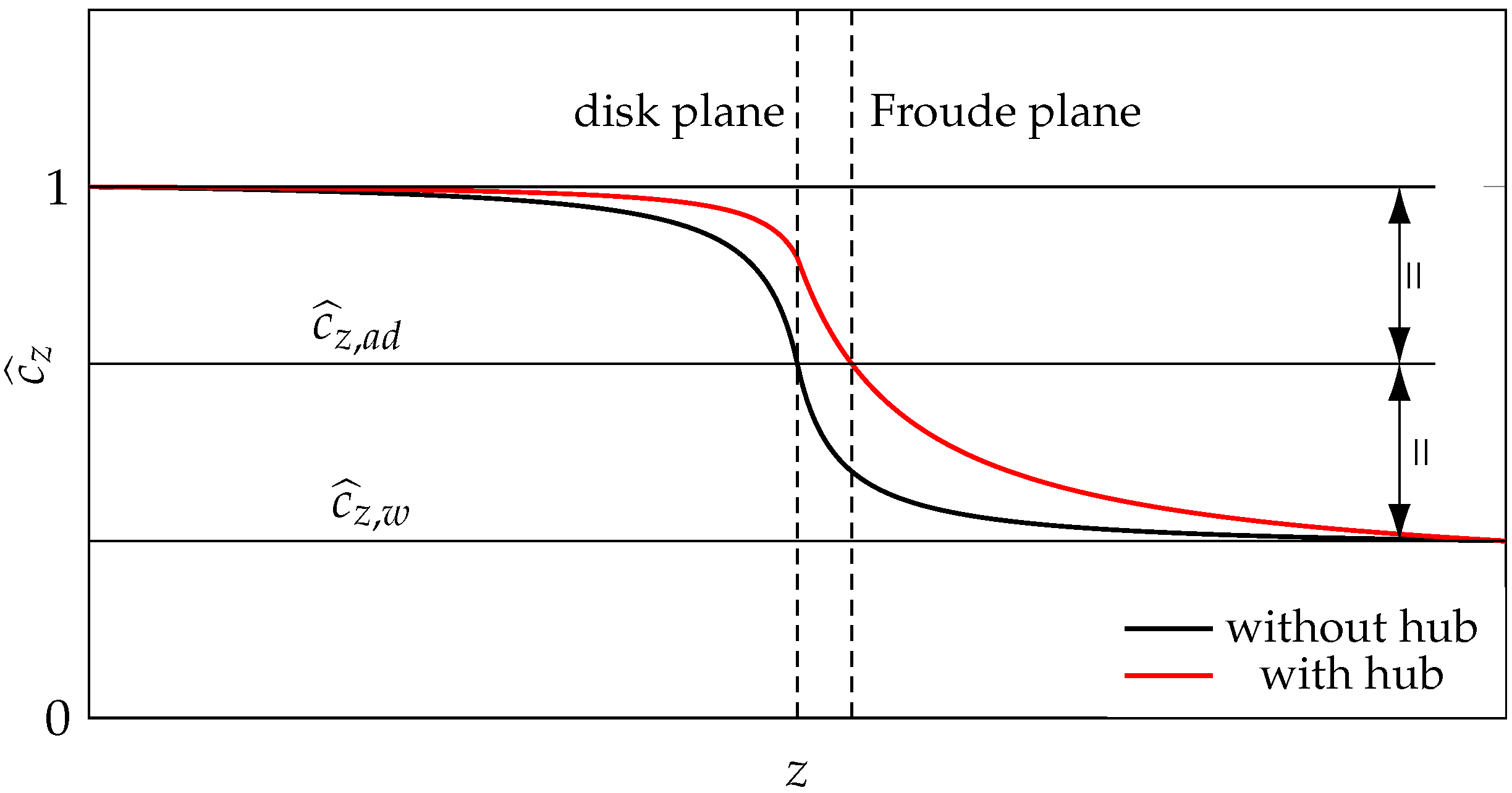 Consequently, the Froude plane is shifted downstream of the disk by the hub blockage, and, by definition, the axial velocity and induction factor there read