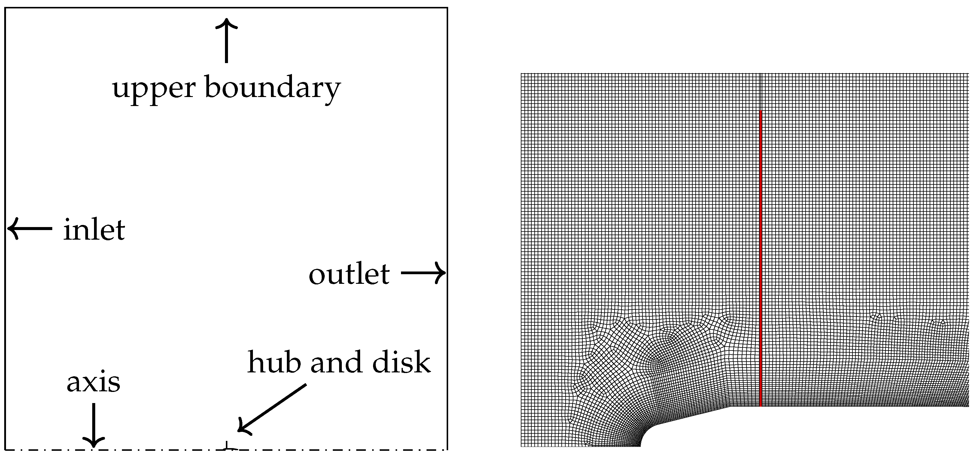 Figure 8 shows the computational domain, the boundary conditions, and a close-up view of the mesh in the hub–nose proximity.