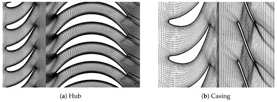 For the flutter analysis, the computational domain consisted of the rotor only, i.e., both the stator and the exhaust were neglected (see Figure 1). Where necessary (time-domain and harmonic balance simulations), the radial distributions of inlet and outlet boundary values for the rotor domain were extracted from the steady simulation of the whole configuration. The block structured mesh was generated with an in-house mesh generator [23] and consisted of 4 million cells for the whole configuration and million cells for the rotor domain alone. Blade wall boundary layers were resolved with , whereas wall functions were used for the hub and casing wall. The mesh had 88 cells from hub to casing. The tip clearance region was resolved with 10 cells in the radial direction. Mesh details are depicted in Figure 2. The relative channel height definition is adopted from [8] (see Figure 1).