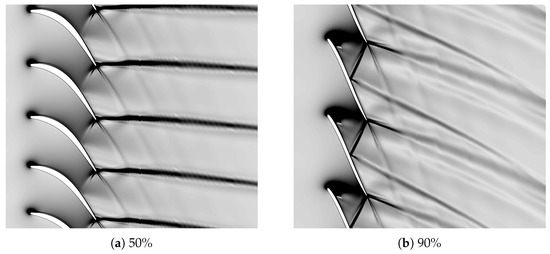 Steady solution (numerical Schlieren) in the rotor domain at 50% and 90% channel height.