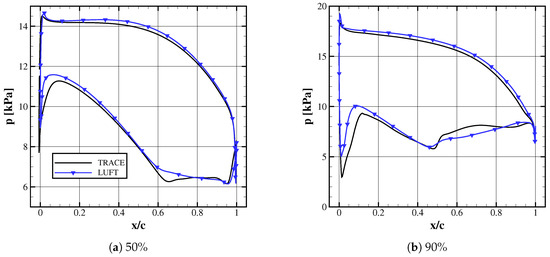 The shock system predicted by the steady solver is shown in Figure 3. The comparison with results obtained with the flow solver LUFT [24] is shown for the blade pressure at 50% and 90% height in Figure 4. The TRACE results show a stronger leading edge suction peak and subsequent shock. The same holds for the pressure rise at about half chord. The authors suspect that these differences stem from the fact that the mesh used in this work was slightly finer (roughly twice as many cells in the rotor domain) than that used for LUFT. The rotor outflow was transonic almost over the whole channel height with maximal Mach numbers of about 1.5 near the casing. The Reynolds number, based on midspan chord length and the mean flow at the rotor outlet, was about 415,000.