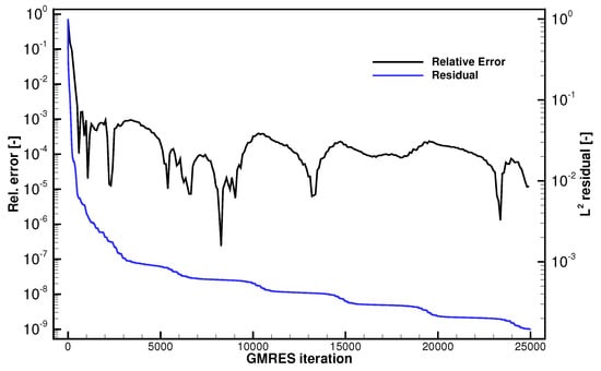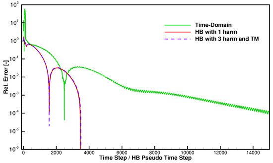 In Figure 11, the convergence of the relative error, again based on current and final values, are plotted for the nonlinear methods. To achieve values within a tolerance of , it took about 3500 pseudo time steps for the harmonic balance setups, whereas the time-domain solver had to be run for about 80 periods. This corresponded to about for the time-domain simulations, compared to for the HB simulation with one higher harmonic and for the HB setup with three harmonics and higher harmonics for the turbulence model. For the interblade phase angle, the linear solver took roughly . It should be noted that in practice a significantly higher error tolerance which would result in smaller CPU times may be acceptable.