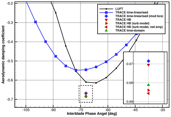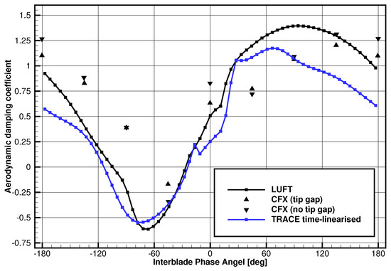 where is the non-dimensionalised amplitude and is the active aerodynamic work [14]. The dynamic pressure was computed from the mass-averaged relative stagnation and static pressures at the stator-rotor interface, which yielded . The results were compared with those obtained by Sun et al. [8] with the linearised solver LUFT [26] and the commercial software ANSYS CFX. Note that the reference data computed with LUFT and the results termed “CFX (no tip gap)” were obtained on a configuration without tip gap. As mentioned above, the configuration “CFX (tip gap)” had a tip gap size which was comparable to ours. The CFX simulations were performed in the time-domain on multi-passage grids to circumvent non-zero interblade phase angles at the perodic boundaries of the domain. The overall agreement between the linearised method in TRACE and LUFT was satisfactory. Discrepancies, however, can be seen for higher nodal diameters, in particular for interblade phase angles above . Acoustic resonance could be discerned near and in the vicinity of , where for the latter region no reduction in convergence speed was observed. The location of the minimal damping predicted by linearTRACE was near , which was very close to the minimum predicted by LUFT. The remainder of this section focuses on this interblade phase angle and compares the results with those obtained with the other simulation approaches.