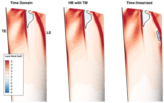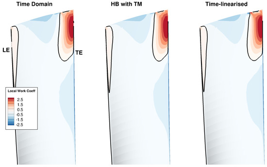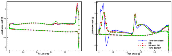 Local work coefficient for predicted by time-domain, harmonic balance, and time-linearised solvers at (left) and (right) channel height.