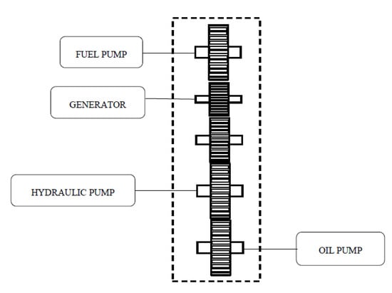The accessory gearbox consists of sets of spur gears connected to each other, each gear drives one element, such as the generator, or pump. The power losses can be divided into load-dependent and no-load dependent according to their mechanical component and their relation to transmitted torque that generates them []. In this way, the total power loss (PL) can be subdivided into no-load and load dependent related to gears ( + ), bearings ( + ), and no-load dependent for seals ().