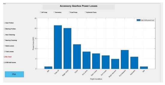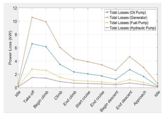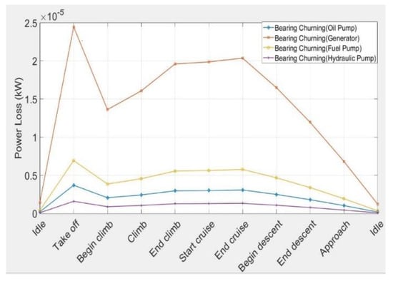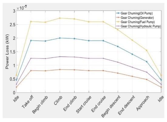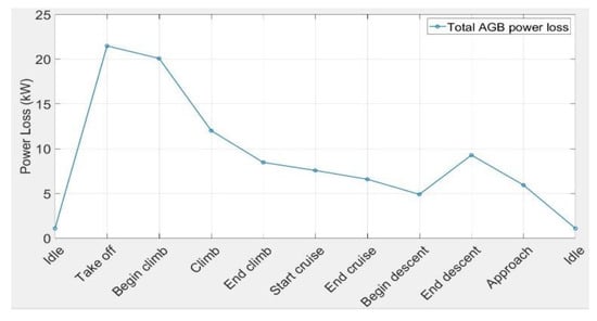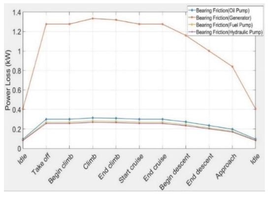 By adding all values in Figure 8, Figure 9 shows the overall power loss occurs in accessory gearbox through all flight conditions. The model presented in this work seems to perform quite well in overall power loss prediction in AGB, given the proper geometry and operating conditions. The overall losses followed the trend of the friction losses because of the high heat generated between the friction surfaces compared to the heat produced by the gears and bearing digging in the oil.