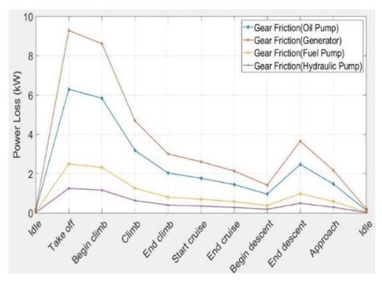Figure 3 shows the friction loss in all AGB elements, where the gear connected to the generator has the highest friction loss in take-off condition compared to other elements, which mainly depends on the friction coefficient and the load applied to the meshing gears.