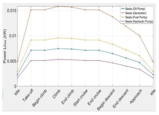 Finally, Figure 7 shows the power loss produced by shaft seals which is considered as no-load dependent loss, and less important in the total losses. It can be seen that the seals losses varied with speed through all flight conditions. The results presented in Figure 3, Figure 4, Figure 5, Figure 6 and Figure 7 confirms that the majority of the heat load in accessory gearbox is generated by gear and bearing friction mechanisms.