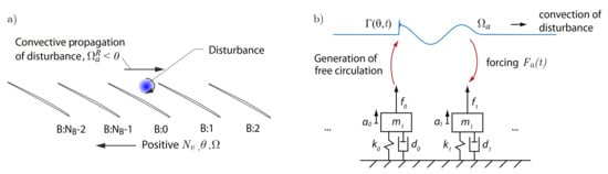 The model presented by Stapelfeldt and Brandstetter [] uses single-degree of freedom mass oscillators to represent blades on a rigid disk. In its simplest form, the individual blades are tuned and structurally uncoupled but aerodynamically coupled by a forcing term. In the case of convective NSV, the forcing is caused by a circumferentially propagating vortical disturbance. This is schematically shown in Figure 1.