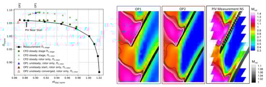 As seen in Figure 3, the steady state CFD simulations of the 1.5 stages did not reach the near-stall operating point but with simulations of the isolated rotor at increased back-pressure the stall mass flow was reached. On this rotor-only characteristic, two operating points are labelled. OP1 presents the point of maximum pressure rise in the rotor and OP2 presents the last point for which convergence in the steady simulation could be reached. Using unsteady simulations, the operating point shifts as indicated in the picture.