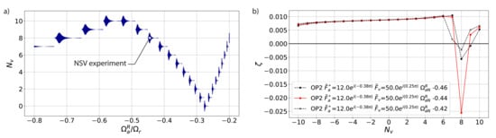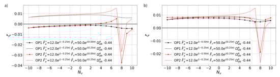 Figure 4a shows the aerodynamic damping curves at the two operating points. While OP1 is stable, OP2 shows significant negative aerodynamic damping in nodal diameter . The associated shift in frequency of the aeroelastic system relative to the in-vacuo frequency is shown in Figure 4b. This shift in frequency shows how the fluid–structure coupling modifies the phase-speed of the aerodynamic disturbance. At the unstable nodal diameter, the aerodynamic disturbance and structural vibration are close to resonance and the shift in frequency is minimal. For , on the other hand, the frequency shifts by 3%. This lock-in effect was also seen in the experiment and numerical simulations [,]. The results at OP1 (stable) and OP2 (instability at = 8) are in agreement with the experimental measurements and validate the frequency domain model.