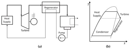 Organic Rankine cycle (ORC) with regenerator after the turbine: (a) cycle layout; (b) process in T,s diagram.