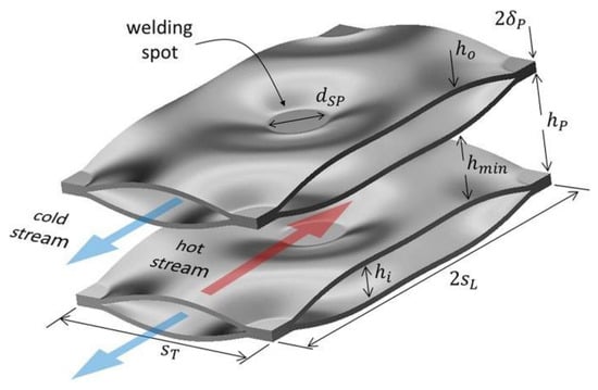 Typically, PPHE are composed of parallel plates arranged as a stack [7]). One flow path of a PPHE can be designed as a smooth, wavy wall-bounded channel. The smooth changes in the channel profile help to reduce pressure losses. Furthermore, it is known from low-speed flow applications that the convective heat transfer coefficients are comparatively high due to the mixing effect at the welding spots working as heat transfer, increasing dimples in the hot stream path [8].
