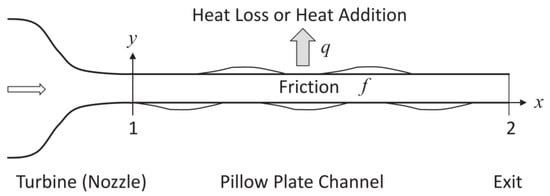 In turbomachinery design processes, a mean line analysis is typically performed at the beginning and provides relevant information for more detailed analyses. In the present case, the considered turbomachinery and the hot gas flow through a pillow-plate heat exchanger establish the technical system for which an essentially one-dimensional compressible flow analysis has to be conducted. Such a configuration is shown schematically in Figure 4, where the turbine is simplified through an equivalent nozzle which creates the inflow conditions (index 1) for the pillow-plate channel. The exit station of the pillow-plate channel is denoted by index 2, and its stream-wise coordinate is denoted by x. The lateral coordinates would be y and z. Although an actual turbine is not a passive nozzle, for the present purpose this simplification is sufficient because the overall characteristic of a high-speed turbine performance is well-approximated by a choking mass flow behavior, similar to a nozzle, as discussed by Dixon and Hall [11] or Horlock [12]. The flow with friction (characterized by the friction factor f) in the pillow-plate channel is subjected to external heat addition or heat loss (denoted by the symbol q).