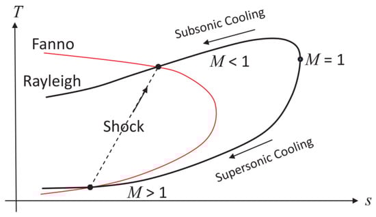 Due to the general balance equations, all possible flow states occurring in the pillow-plate channel are on a Fanno–Rayleigh flow line in the T,s diagram for a given mass flow rate. The lines for ideal Fanno flow and ideal Rayleigh flow are plotted schematically in Figure 5. Without friction but with heat transfer, the possible flow states would be described by the Rayleigh flow line in Figure 5. Cooling processes would move the flow states away from the point with maximum entropy s. In the case of subsonic flow (entry Mach number ), lower exit Mach numbers would result due to cooling, whereas in the case of supersonic flow (entry Mach number ), the Mach number would increase due to cooling. For the supersonic branch of the Rayleigh line, a shock could occur in the cooling channel leading to a subsonic flow state, as sketched in Figure 5 (see John and Keith [13]). The condition for that shock is given at the common point of the Fanno and the Rayleigh flow lines (at the given mass flow rate).