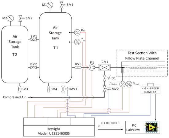 The experimental investigations were performed utilizing a blow-down wind tunnel which is schematically shown in Figure 6 and explained in more detail by Passmann et al. [15]. The working fluid was compressed air (maximum pressure 8 bar). The filling of the air storage tanks was enabled by the magnetic valve MV1. The temperature and pressure of the storage tank system were recorded continuously. The complete test facility was controlled using a PC and LabView software, from the manufacturer National Instruments, based in Austin, Texas. The blow-down test run was controlled by a coaxial valve CV1, see Figure 6. The pillow-plate channel was placed in the test section of the wind tunnel, as illustrated in Figure 7a.