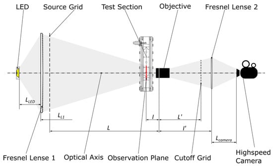 Whereas conventional schlieren optics are treated well in the literature, focusing schlieren optical systems are employed less frequently. The principal setup of the employed focusing schlieren optics is shown in Figure 8, and details can be found elsewhere (see Weinstein [16] and Passmann et al. [17]). In combination with a high-speed camera, the focusing schlieren optics enabled a detailed visualization of transient phenomena at certain observation planes in the test section.