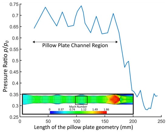 A general feature of Fanno flow is its choking behavior. This means that for high subsonic inflow Mach numbers, a shock occurs at the end of the pillow-plate channel (, independently on the stagnation pressure level ). This is demonstrated in Figure 9. In Figure 9, conventional schlieren pictures are shown at the outlet region of the pillow-plate channel for different stagnation pressure levels. In any case, Mach number M = 1 is reached at the end of the channel, and a shock occurs. For higher pressure levels, a complex pattern results in the expanding flow in the outlet buffer zone. Furthermore, a periodic shading at the pillow-plate channel region (left-hand side of the pictures shown in Figure 9) is indicating an oscillating behavior of the Mach number distribution within the channel due to the periodic surface profile. This observation corresponded well with the variation of static pressure distributions measured along the pillow-plate wall, which is shown for a higher stagnation pressure level in Figure 10. The color picture inlet in Figure 10 shows a simulated Mach number distribution by Passmann et al. [10] with its expanding jet after the shock (red area) and the slight oscillations along the pillow-plate channel region. The oscillating behavior of the static pressure is well-observable in Figure 10. The pressure variations are coherent with the pillow-plate wall surface profile. Accordingly, with the analytical prediction for inviscid compressible flow, see Equation (5) and solution (4), the static pressure oscillations directly reflect the pillow-plate pattern. As a result of the profile and the dimple orientation along the pillow-plate channel, see Figure 7, the amplitudes of the maxima in Figure 10 alternate between two different levels (i.e., the odd maxima are slightly higher than the other maxima due to the effective cross-section area of the channel including the dimple pattern). Furthermore, a slight decrease in the average static pressure with increasing channel length coordinate can also be identified in Figure 10. This slight decrease represents the pressure drop due to friction within the channel. However, a substantial pressure drop occurred due to the shock at the end of the pillow-plate channel.