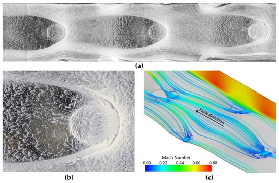 Here, the observation plane of the focusing schlieren optics was in the middle of a dimple. The two-layer structure of the flow became visible in Figure 11b: a low-speed flow in the dimples and a turbulent, compressible flow above the dimples in the channel. Utilizing surface oil flow visualizations shown in Figure 12, the main vortex structure caused by the dimples could be demonstrated. Figure 12a shows the regular surface oil flow pattern of the pillow-plate wall with its several dimples. As known from incompressible flow analysis, a horse-shoe vortex system is caused by dimples. In the dimples, strong recirculation zones indicated by the accumulation of white oil can be identified in Figure 12b. Figure 12c shows the results of a simulation including all the flow features discussed above.