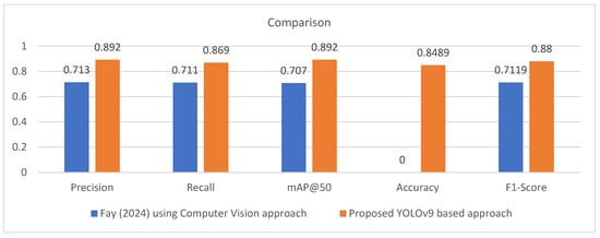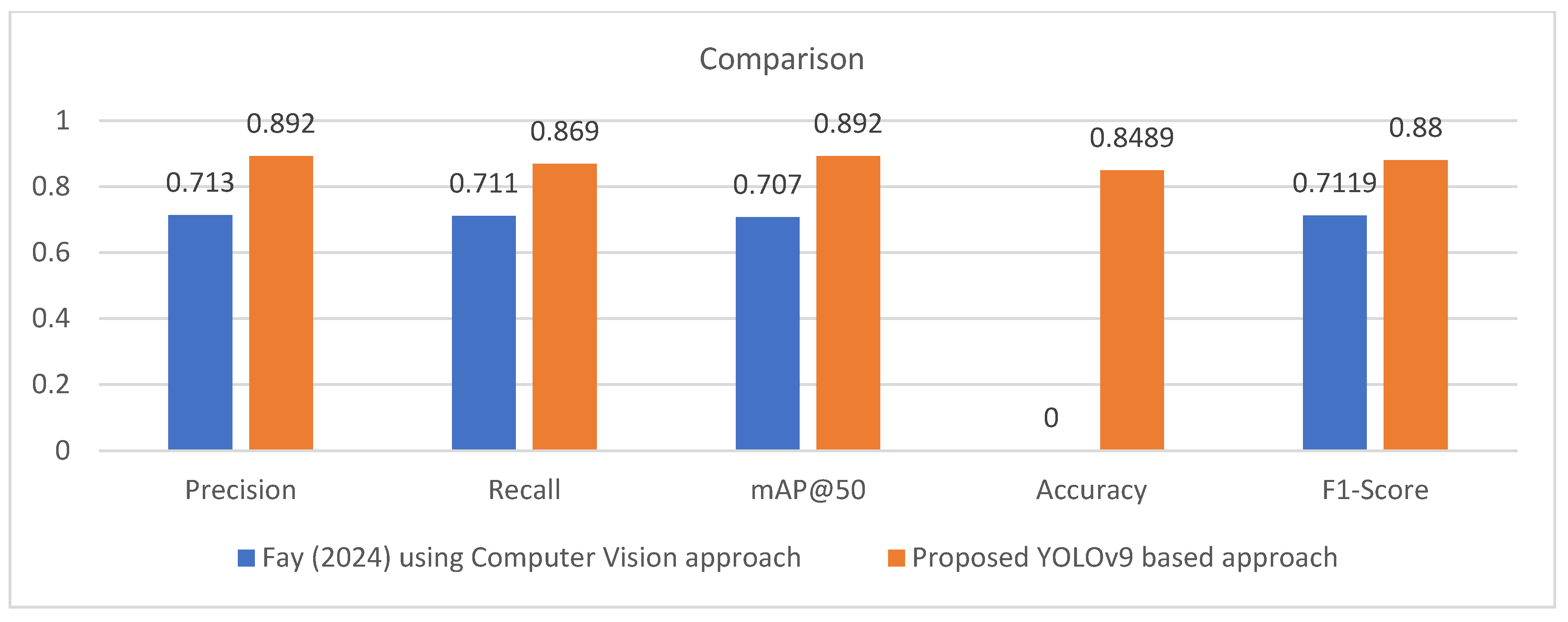 To compare the proposed study with state-of-the-art, the study by Fay (2024) [42] is the only study that is closest to the proposed approach based on common dataset and deep learning approaches being employed in both studies. So, we took this as a baseline study. Table 5 and Figure 8 present the comparison with the baseline study. It is apparent from the comparison that the proposed study significantly outperformed the baseline study in terms of precision, recall, mAP@50, and F1-score by 17.9%, 15.8%, 18.5%, and 16.81%, respectively. The main reason behind this improvement includes better preprocessing including augmentation and updated YOLOv9 model. However, accuracy was not reported for the baseline model.