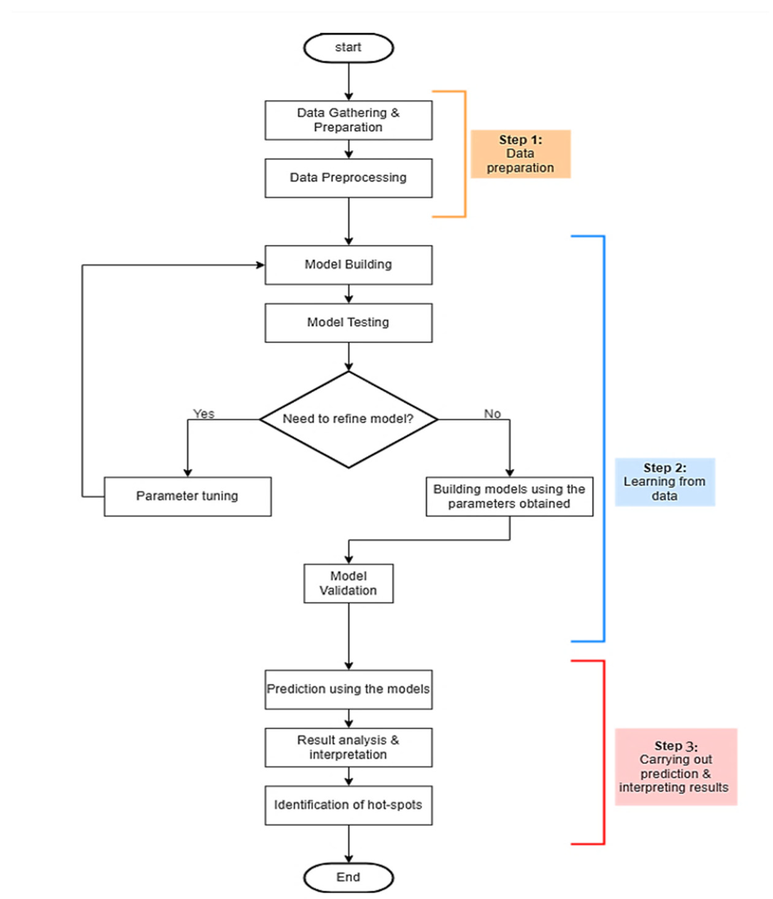Step 3: Prediction and Results Interpretation. The concluding phase encompasses activities such as “Model-Based Predictions,” “Result Analysis and Interpretation,” and “Hotspot Identification.” The model, refined in Step 2, is exposed to a new dataset to generate predictions. Following the prediction, the results undergo comprehensive analysis, leading to interpretations that identify the most effective model. Additionally, ‘hotspots’ or areas for potential improvement in subsequent projects are identified.