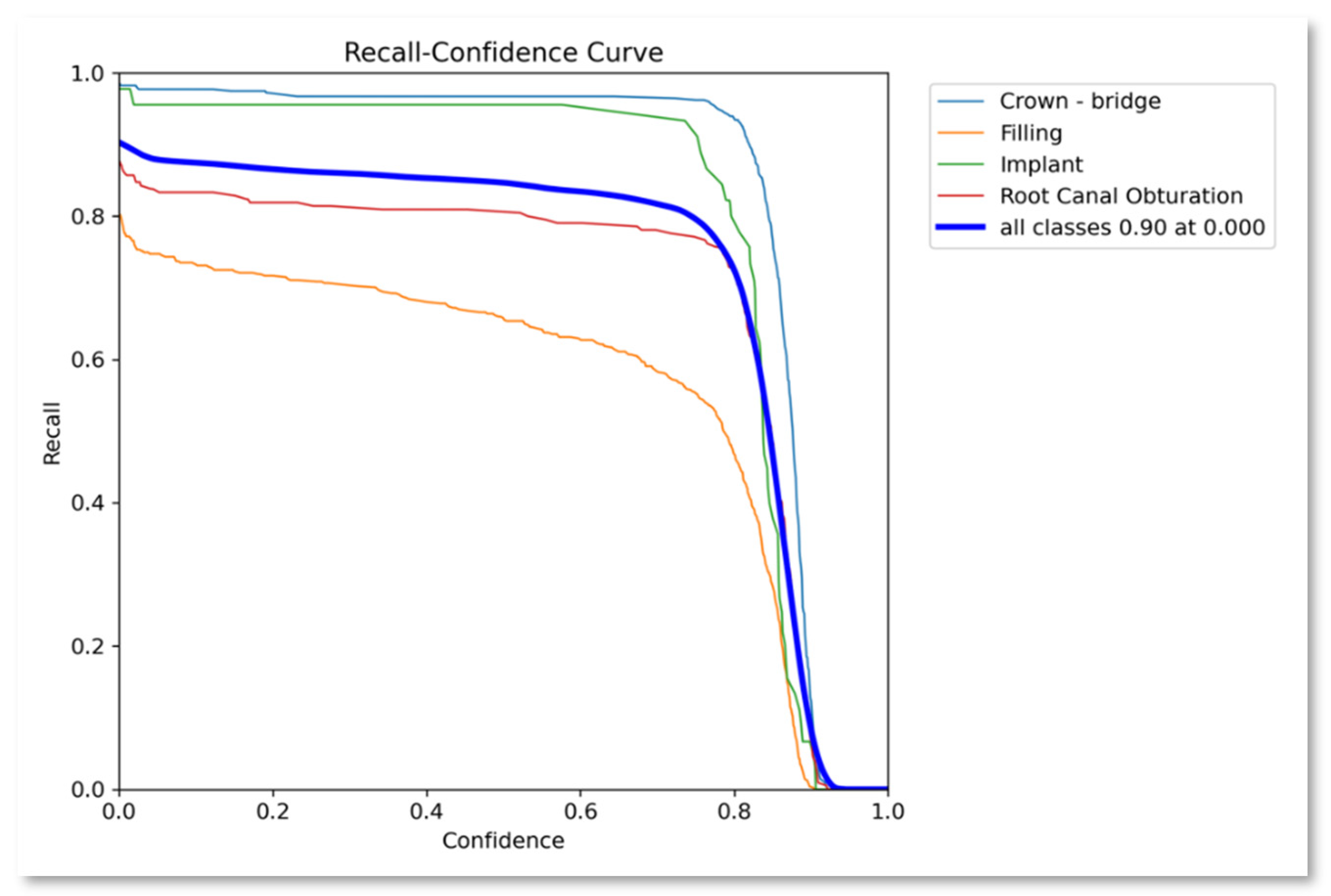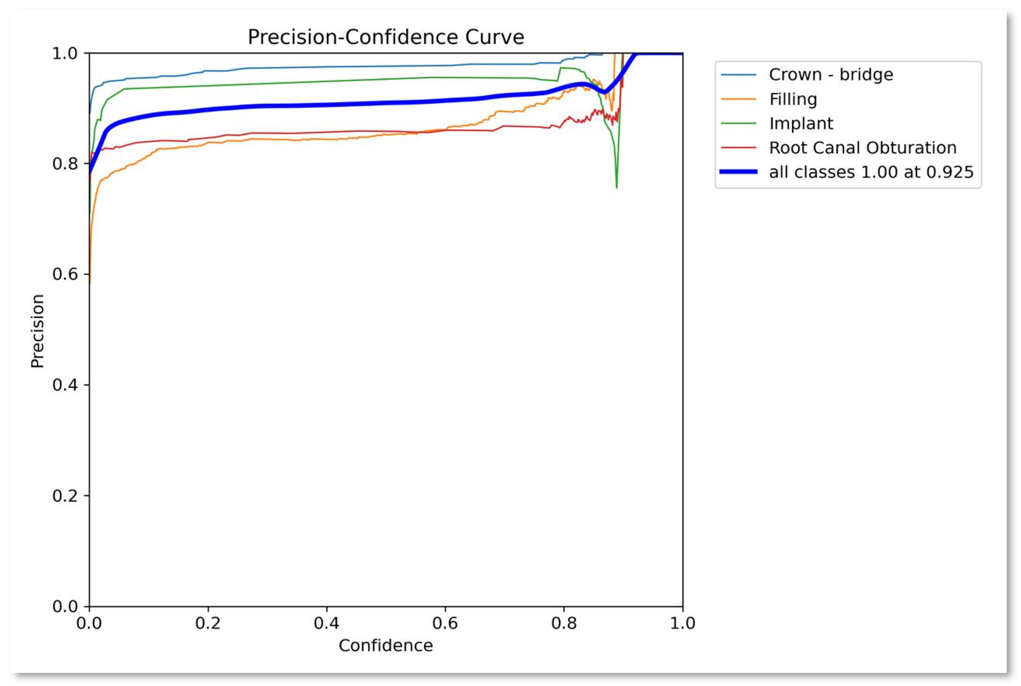 Figure 6 represents the precision-recall confidence curve for the proposed approach. The precision–recall curve is a graph of the relationship between precision and recall for different thresholds. It is used for the summary of the trade-off between the positive predictive value and the true positive rate of a predictive model for different probability thresholds. A high area under the curve is both high recall and high precision, where high precision is equivalent to a low false positive rate and high recall is equivalent to a low false negative rate. The average precision–recall value for all the classes is 0.892, while the highest value is achieved by the ‘Crown’ class at 0.988, followed by ‘Implant’ class at 0.956. ‘Root canal obturation’ class obtained 0.8333 while the ‘Filling’ class exhibited a relatively poor performance at 0.7880. The results are very much supported by and aligned with the normalized confusion matrix given in Figure 2.