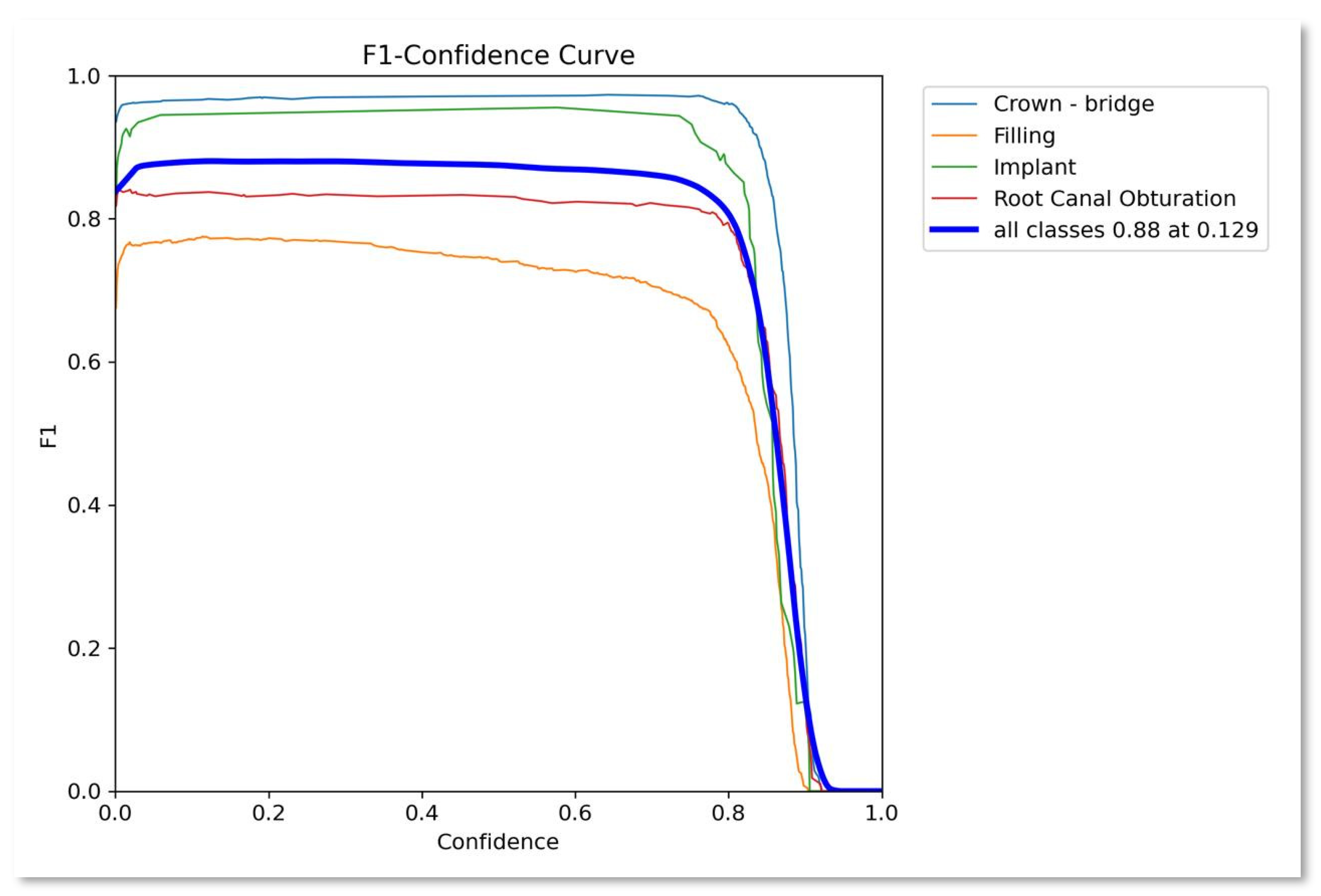 Based on the color coding in Figure 2, it is apparent that the crown-bridge class outperformed all the other classes, with the darkest blue. Followed by the implant class, root canal, and filling, respectively. The same trend can be further observed in the subsequent analyses, including various metrics and graphs. It is mainly because the dataset is unbalanced, with varying numbers of instances per class.