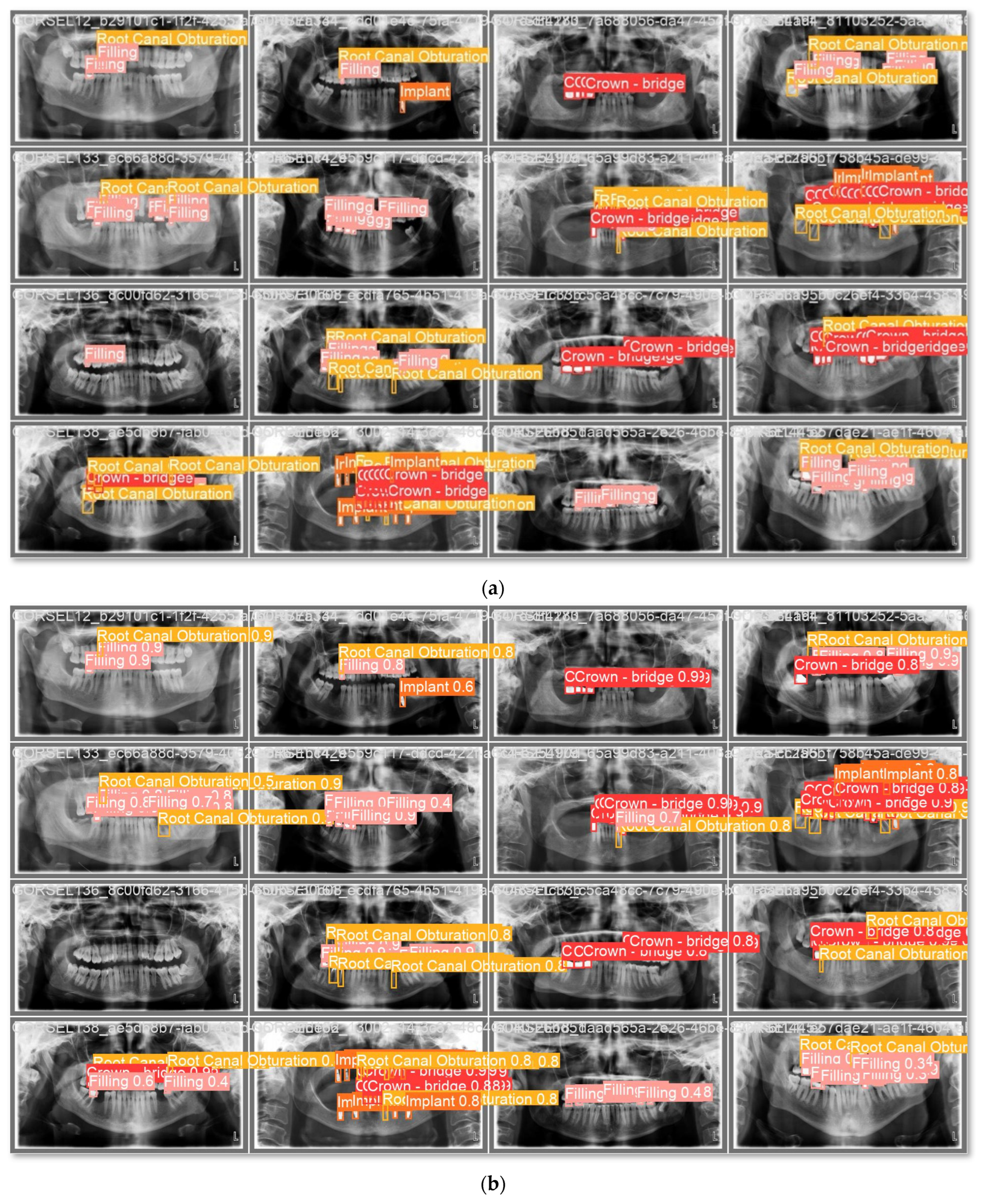With that said, the proposed model achieved an average accuracy of 0.8489, a precision of 0.892, a recall of 0.869, an F1-score of 0.880, and an mAP50 of 0.892, as shown in Table 3. Crown-bridge, implant, root-canal, and filling performance were, respectively, higher to lower.