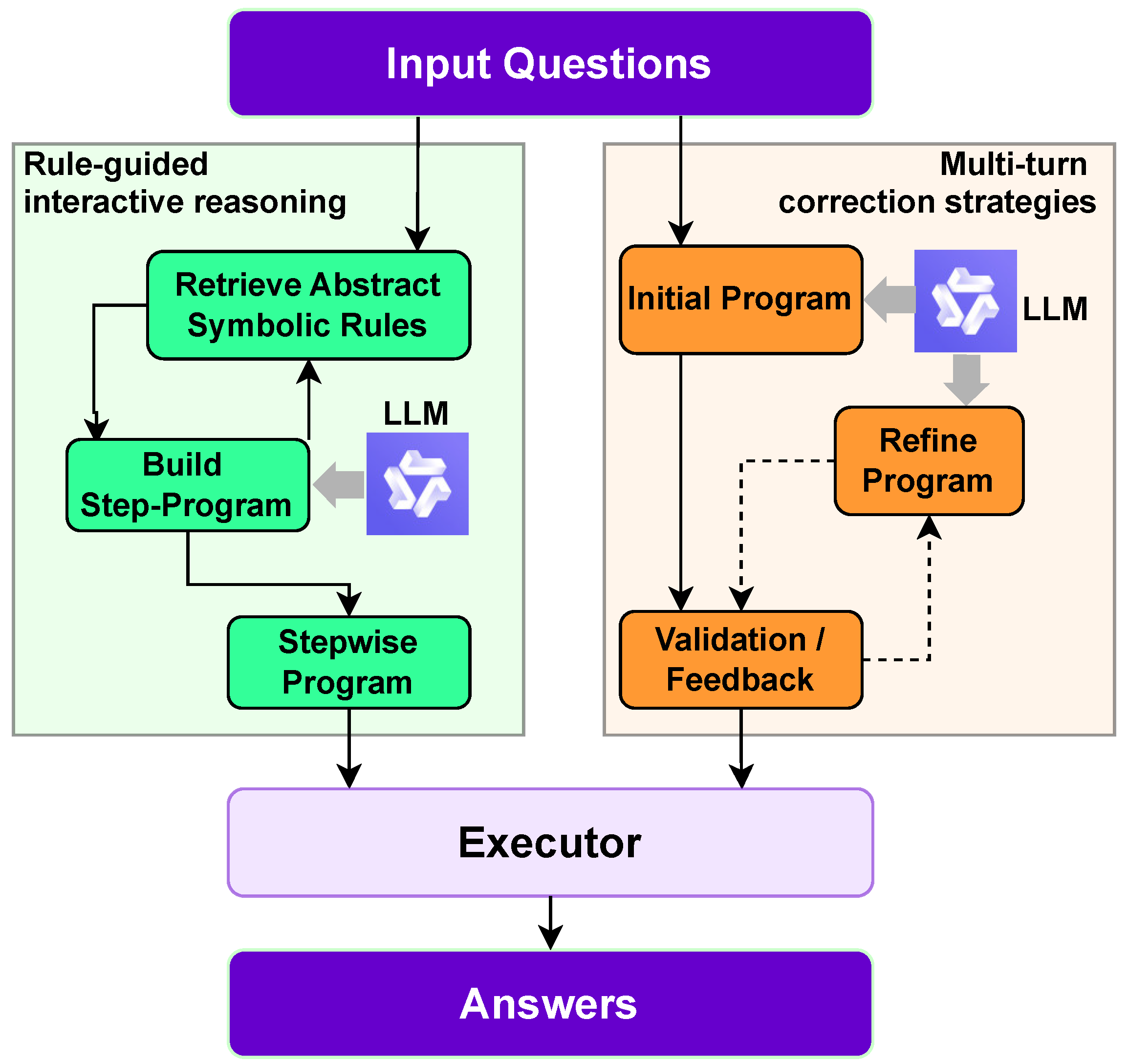 - Multi-turn correction strategies. Another line of research first generates an initial program in one pass and then iteratively refines it through prompt rewriting, self-correction, or feedback-based validation [4,5,37,38]. For example, CodeAlignKGQA [5] formulates complex KGQA as knowledge-aware constrained code generation and applies multi-turn code alignment to progressively fix logical and semantic errors; SymKGQA [4] combines symbolic reasoning structures with execution feedback to iteratively refine logic, enhancing interpretability and execution accuracy; FUn-FuSIC [39] introduces an iterative repair loop that uses a suite of strong and weak verifiers to successively refine candidate logical forms; and prompt design techniques from related tasks [40], have been adapted to KBQA to improve structural alignment and reduce logical errors. While more robust to initial mistakes, these approaches incur additional latency and may suffer from inconsistencies between structural logic and factual grounding.
