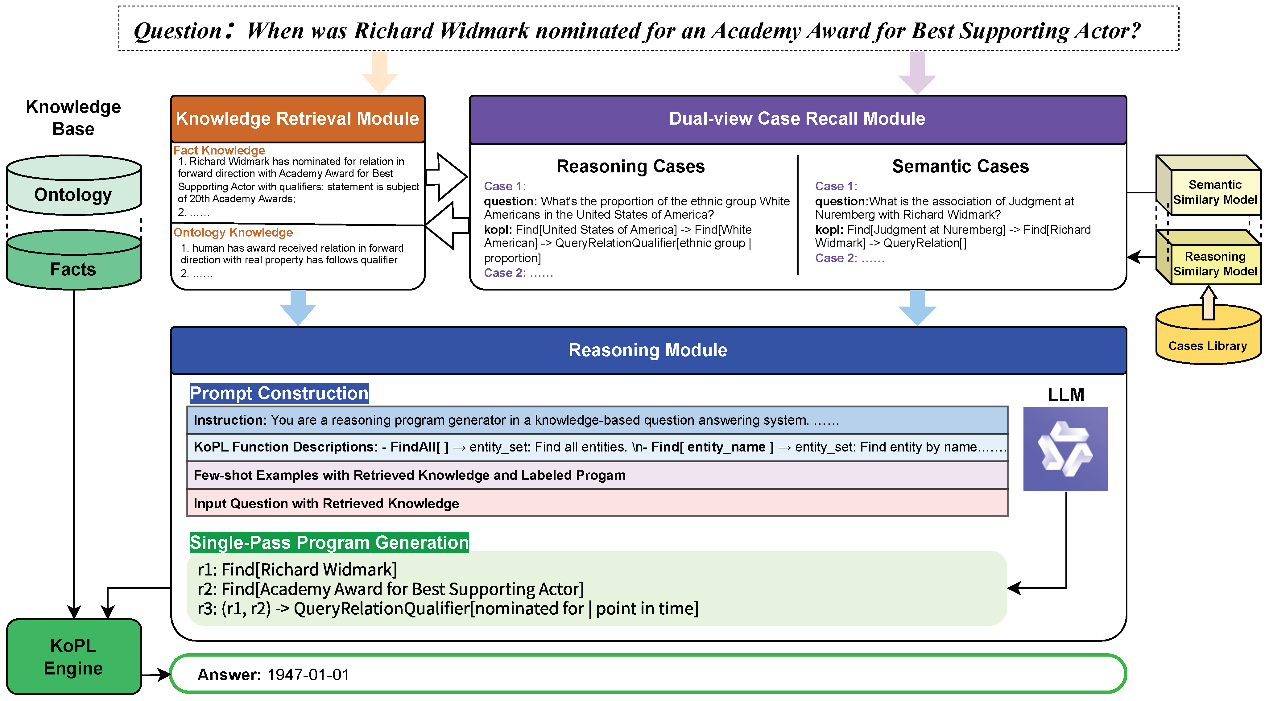 - Dual-View Case Retrieval—The system retrieves exemplar reasoning cases from two complementary perspectives. The semantic-view model recalls questions involving similar topics (e.g., awards or nominations), whereas the structural-view model identifies KoPL programs with reasoning patterns similar to the target query. For this example, the latter often surfaces chains such as Find → Find → QueryRelationQualifier, which match the required reasoning structure.