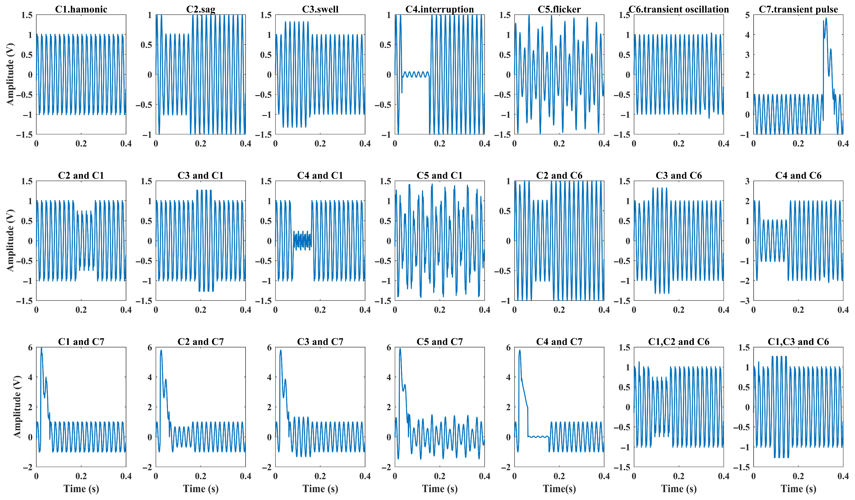 In this paper, twenty-one power quality disturbances are studied and labeled from C1 to C21. These disturbances include seven typical single disturbances (C1–C7) and fourteen composite disturbances (C8–C21). Based on IEEE Std 1159-2019, a total of 21,000 waveform samples are generated using MATLAB 2021a, with 1000 samples per power quality disturbance class. The twenty-one power quality disturbance signals are summarized in