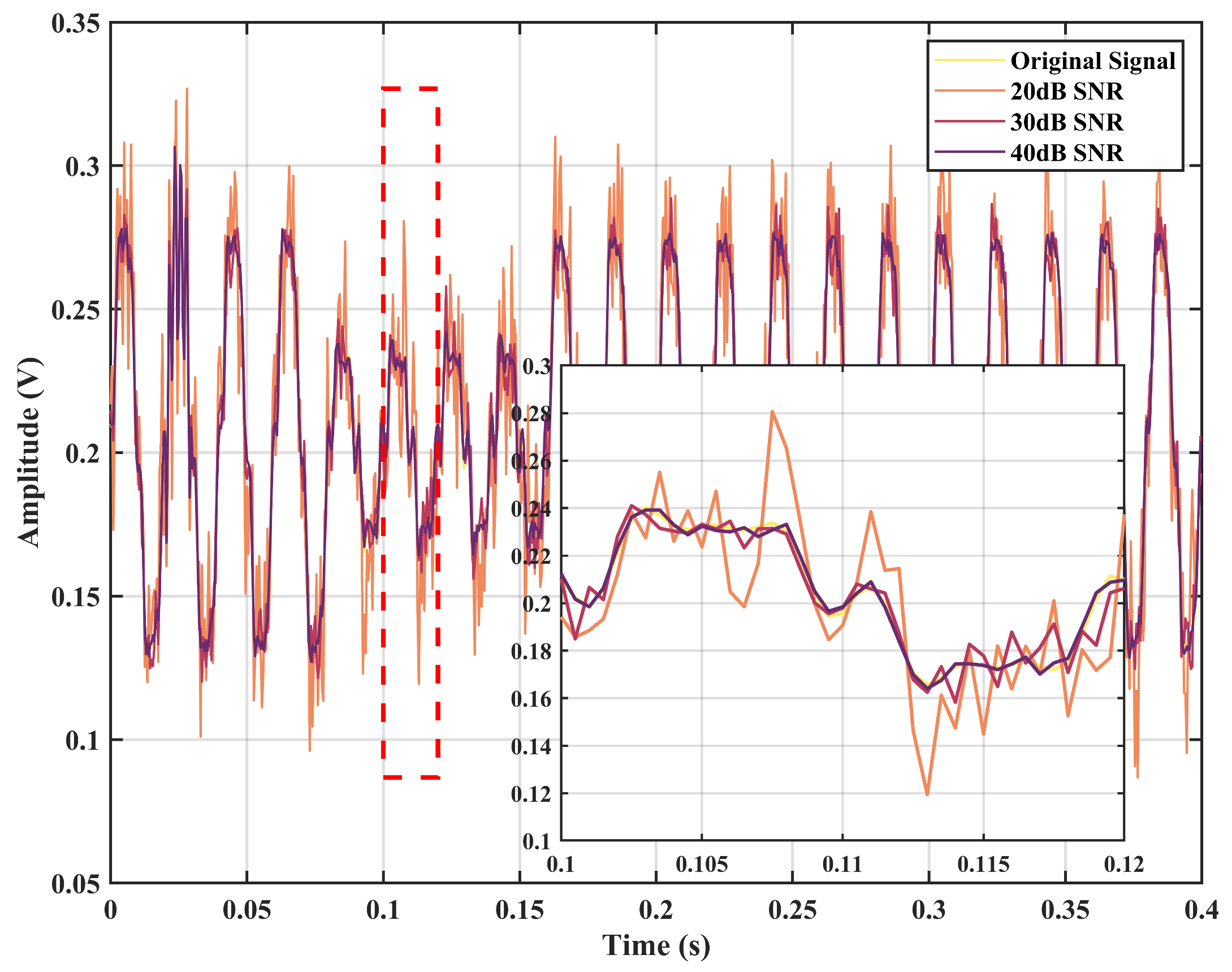Figure 4 compares the original signal with signals contaminated by noise at 20 dB, 30 dB, and 40 dB SNRs. From