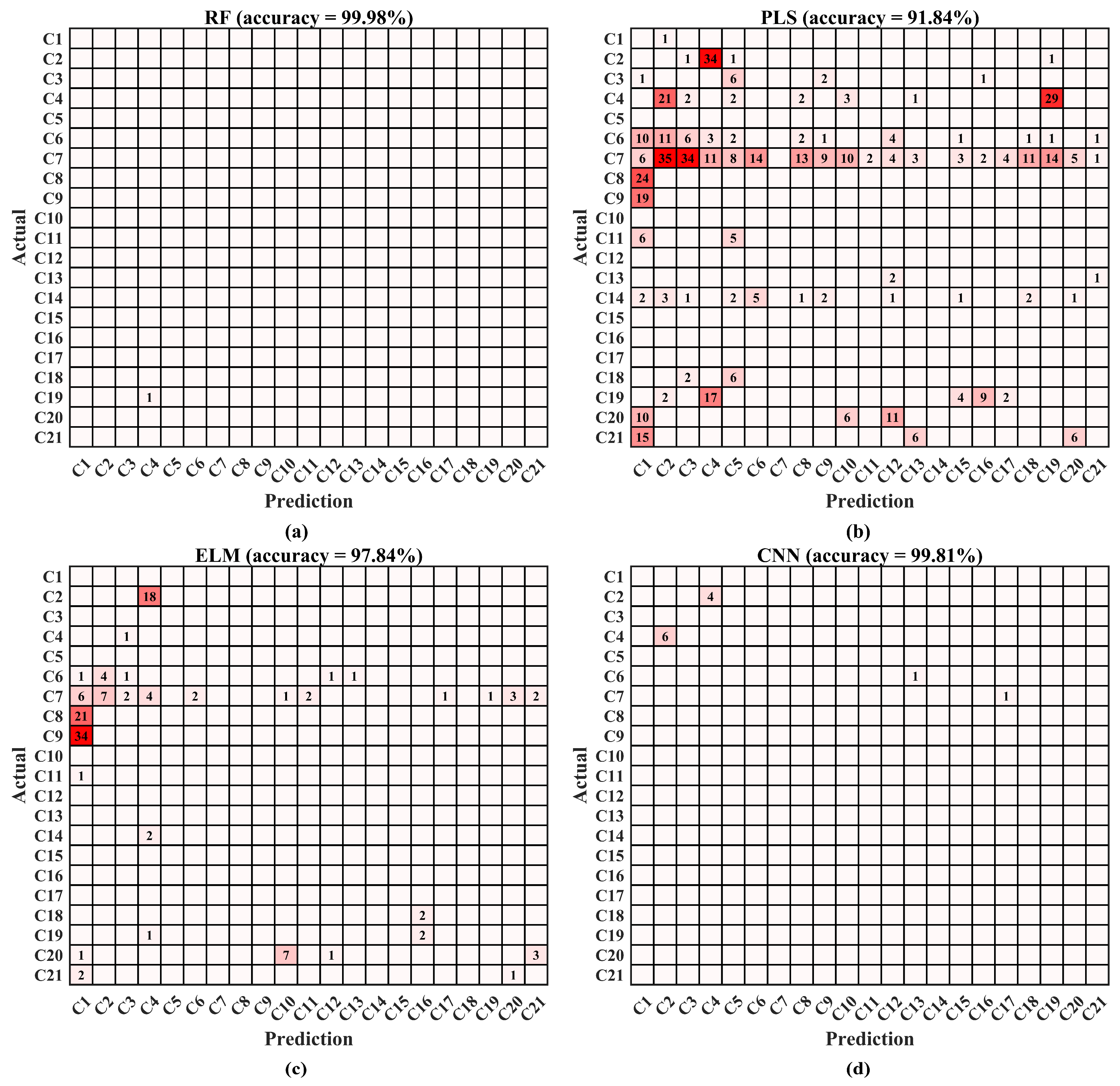 The feature datasets obtained through three different feature extraction methods are fed into the classification models—RF, PLS, ELM, and CNN—for training. To comprehensively assess a classifier’s effectiveness, four primary metrics are commonly used: accuracy, precision, recall, and F1 score. The resulting classification performances are presented in