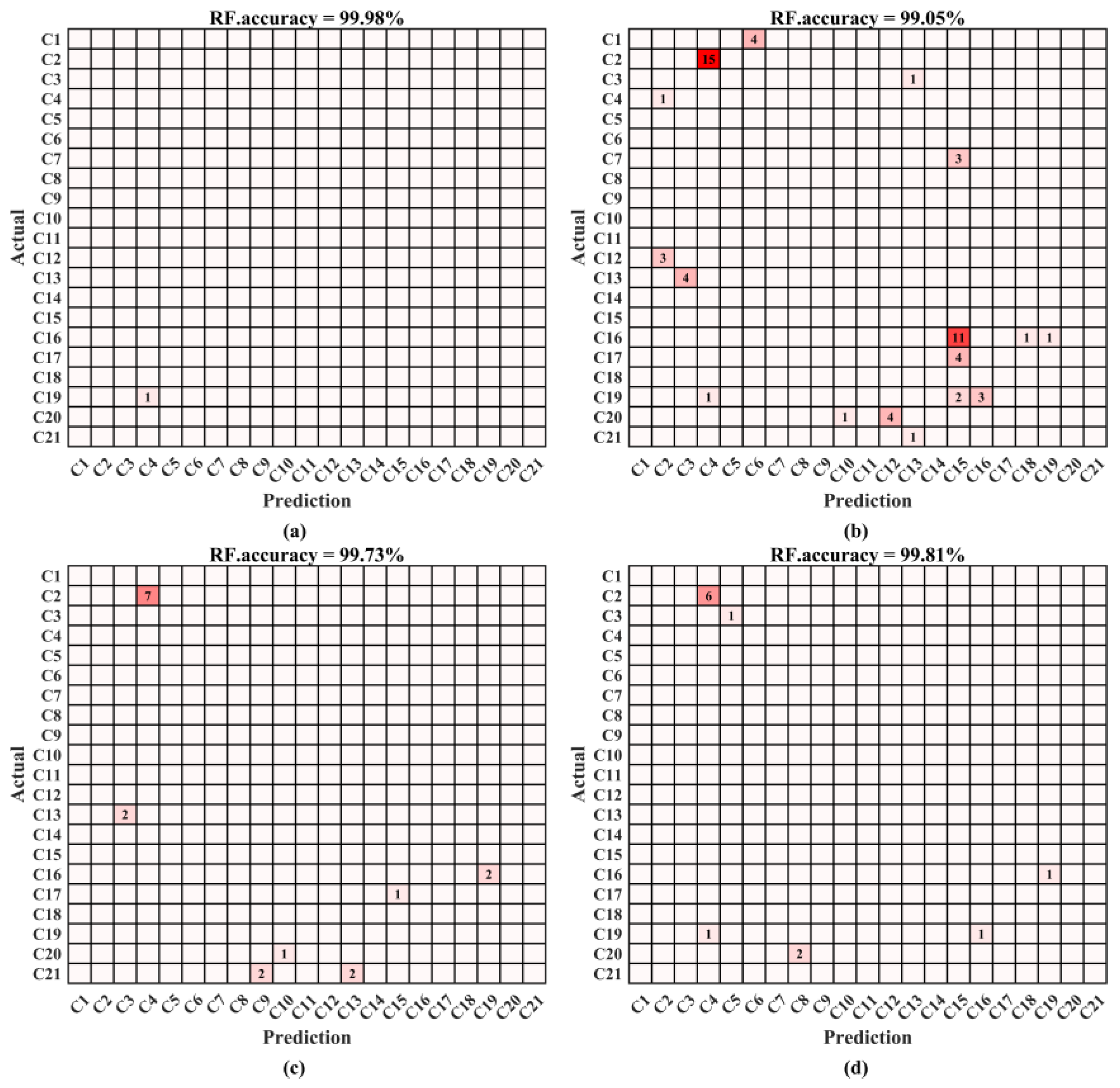 Figure 5d exhibits more misclassifications among single disturbances but still attains 99.81% accuracy. In contrast, the PLS model in