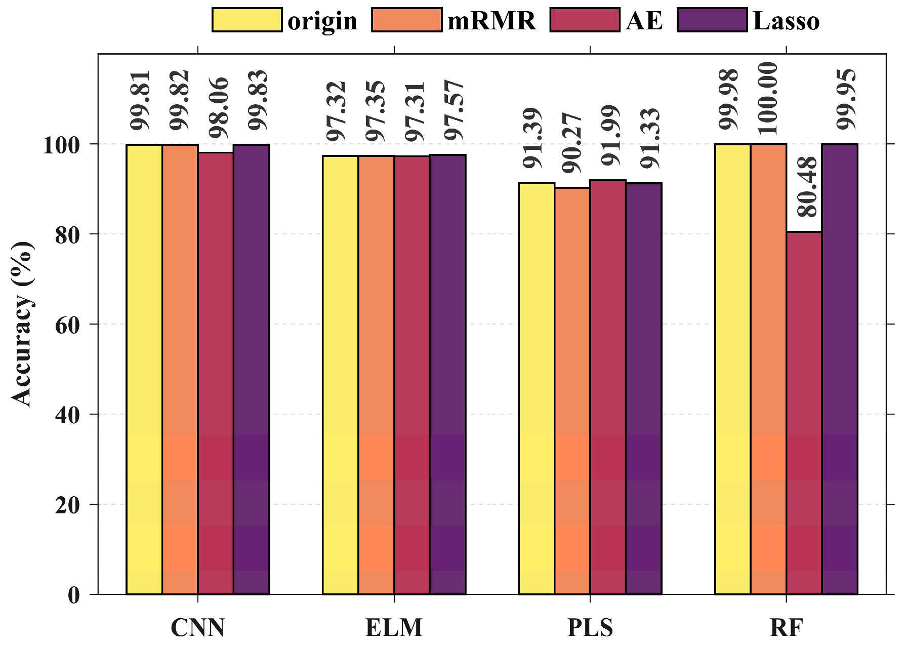 Figure 7, the CNN model achieves its highest accuracy of 99.83% using the Lasso-selected feature set. On the AE-selected feature set, PLS demonstrates superior performance. For the mRMR-selected feature set, the ST-mRMR-RF model performs best, achieving 100% accuracy. The mRMR-selected feature set not only reduces Random Forest training time but also improves classification accuracy. Notably, feature selection does not always enhance performance. For example, after AE-based reduction, the ST-AE-RF model accuracy decreases to 80.48%.