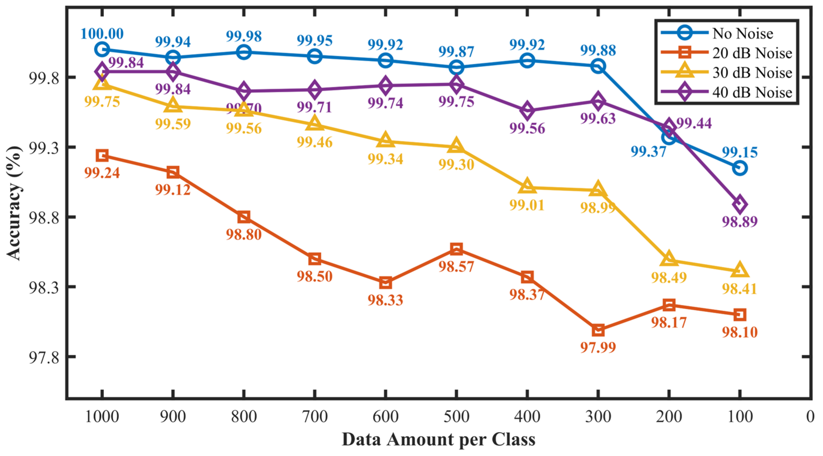 Figure 8. In noise-free conditions, the model requires only 30% of the original data to maintain near-optimal performance. Under 20 dB noise, accuracy gradually decreases as data volume reduces, declining from 99.24% to 98.10%. In low-to-moderate noise environments of 30 dB and 40 dB, accuracy remains at 98.99% and 99.63%, even when data volume decreases to 300 samples. These results indicate that under low-to-moderate noise, the model effectively suppresses noise and retains efficient learning with limited data.
