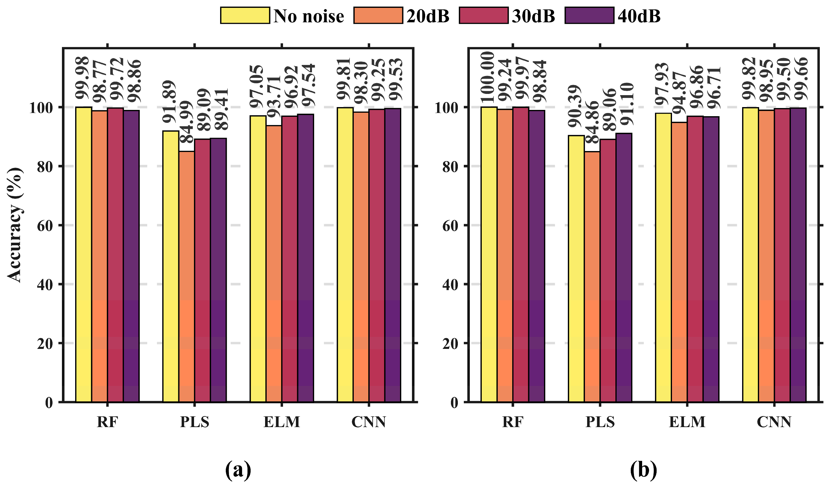 Figure 8, the ST-mRMR-RF method achieves 100% accuracy using the optimized feature set under noise-free conditions. Under noisy conditions with SNRs of 20 dB, 30 dB, and 40 dB, it maintains accuracies of 99.24%, 99.75%, and 99.84%, respectively. In contrast, the ST-mRMR-PLS and ST-mRMR-ELM methods exhibit performance degradation at 20 dB SNR, with accuracies decreasing to 84.86% and 94.87%, respectively. This result indicates their limited noise robustness. The ST-mRMR-RF method consistently demonstrates the highest overall performance, regardless of noise presence. Overall, although classification accuracy decreases with increasing noise, the ST-mRMR-RF method remains robust, maintaining 99.24% accuracy even under severe 20 dB noise.