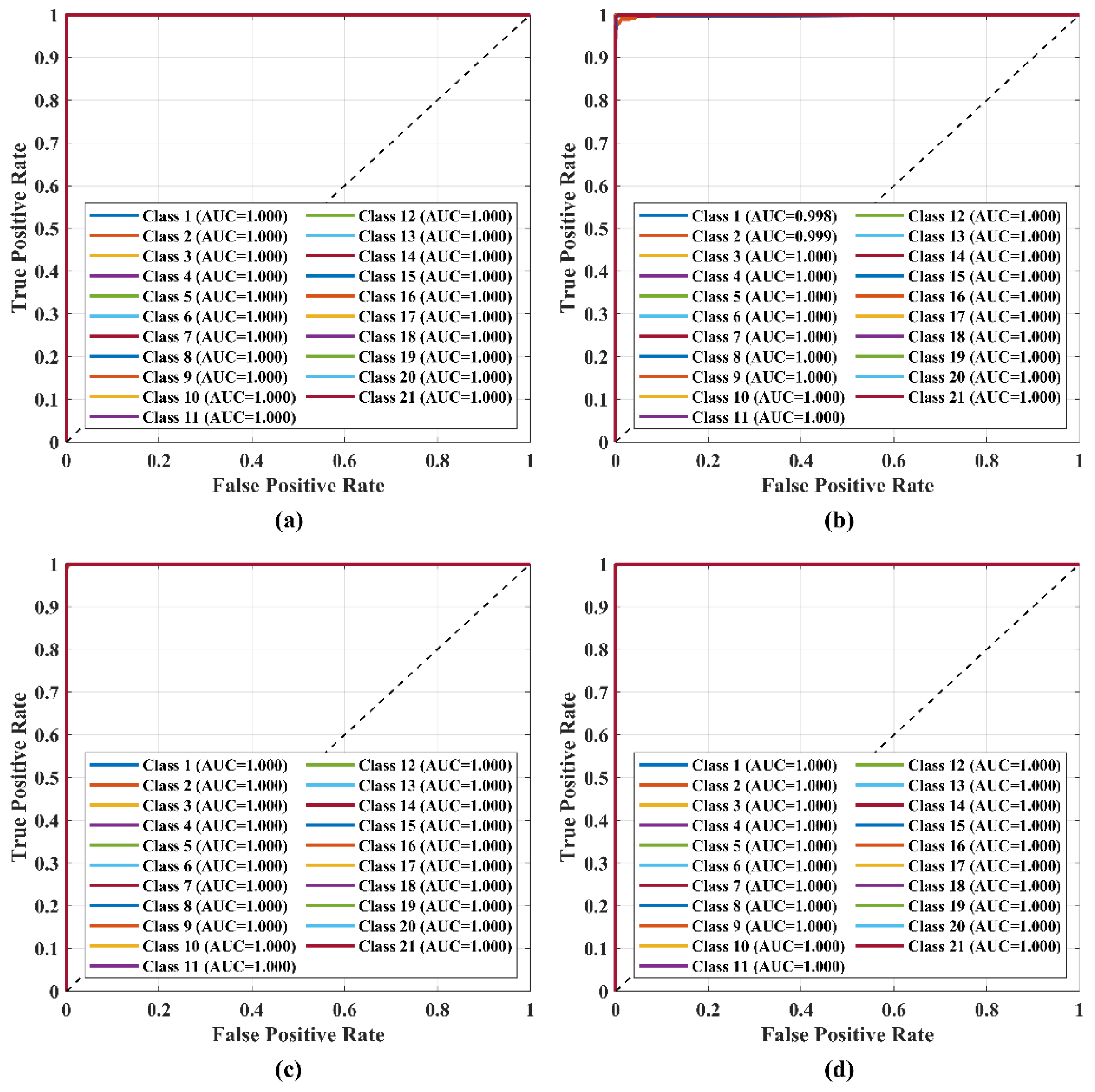 Figure 10, under noise-free conditions, ROC curves for all classes approach the top-left region, yielding an AUC of 1.000. This result indicates near-perfect classification capability. Even under 20 dB noise interference, AUC values for most classes remain high, such as 0.999 for Class 2. This performance demonstrates the strong noise robustness of the proposed model’s feature representation.