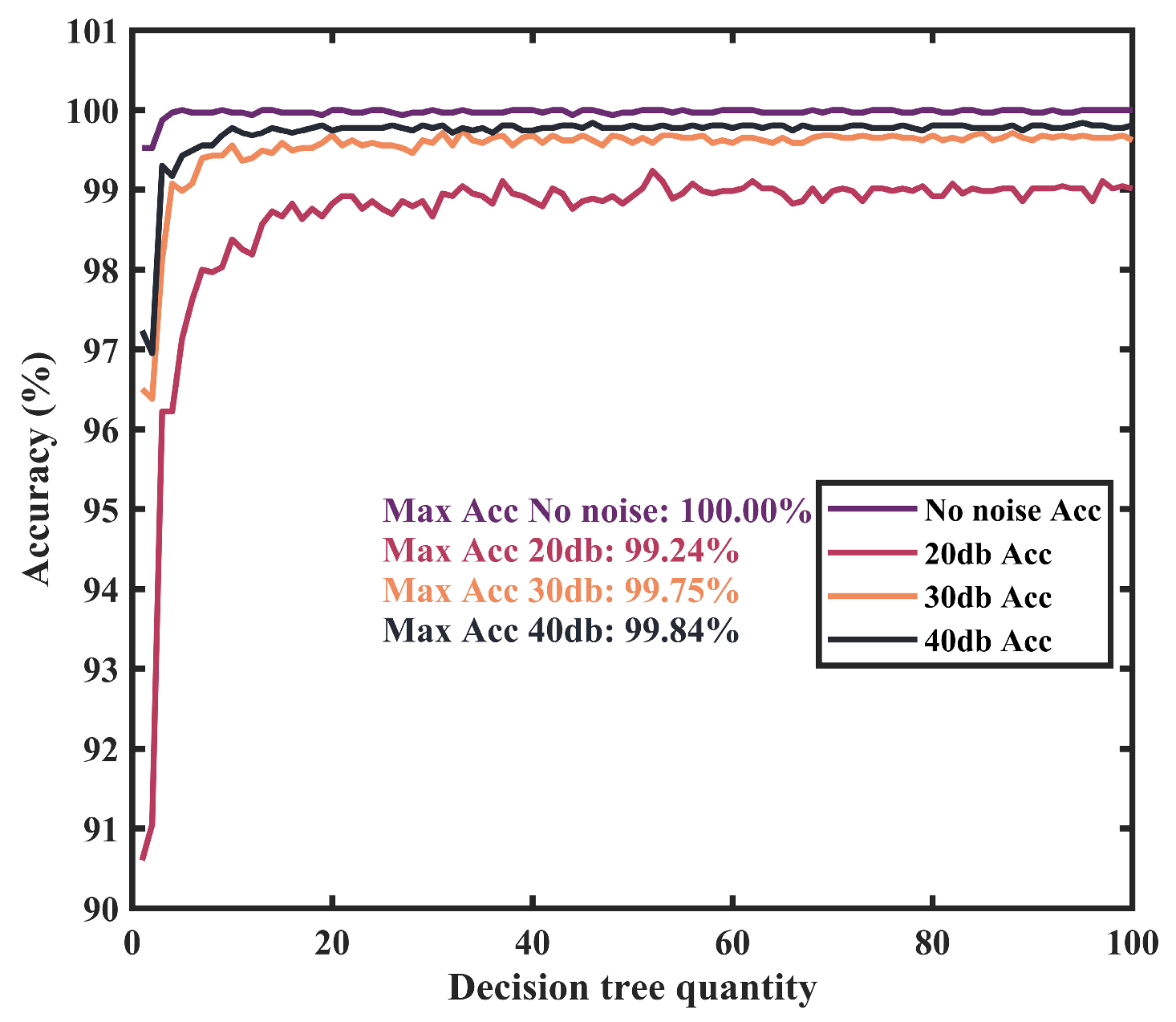 Figure 11 shows that classification accuracy increases and gradually converges as the number of decision trees increases. Under noise-free conditions, accuracy reaches 100% when the number of trees equals 21. With SNRs of 20 dB, 30 dB, and 40 dB, accuracies are 99.24%, 99.75%, and 99.84% at 52, 33, and 46 trees.